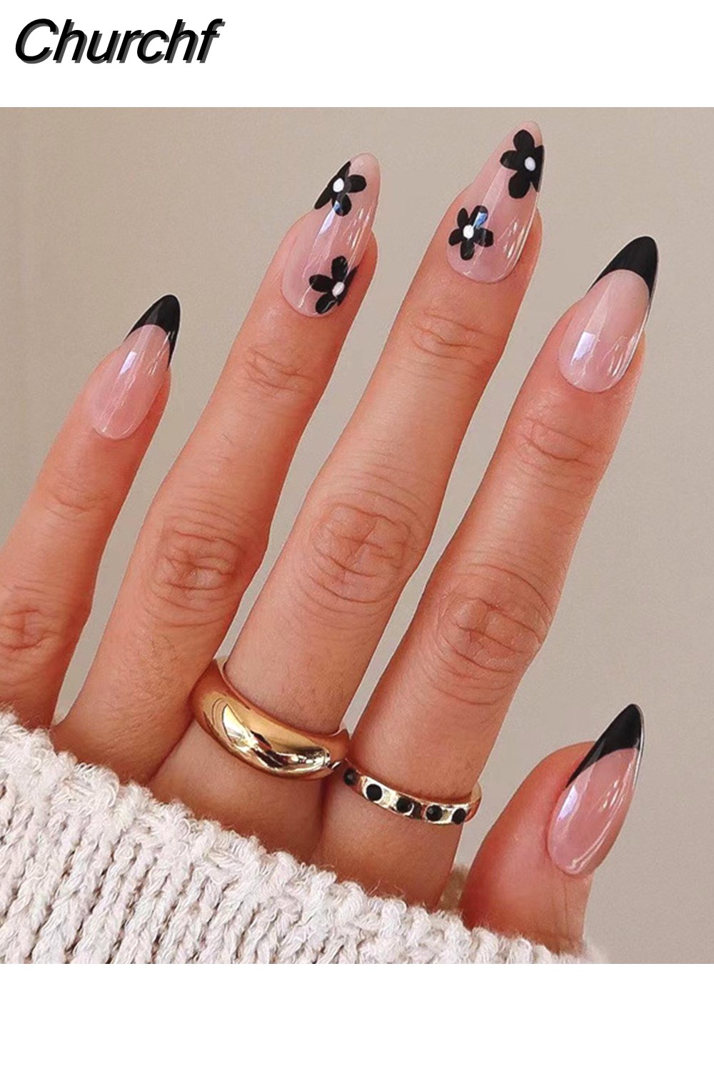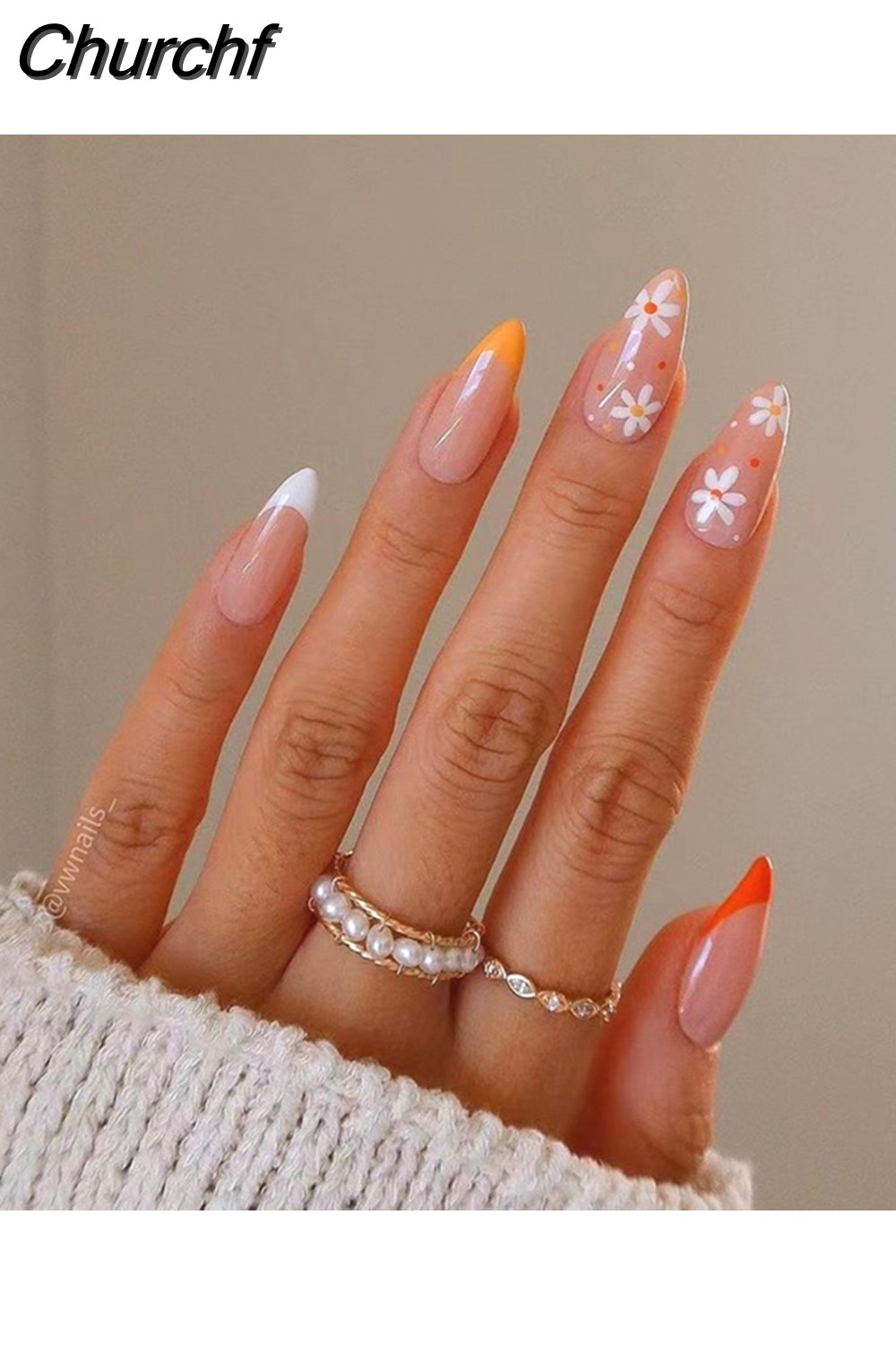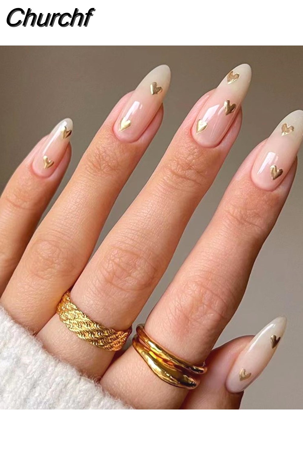 Churchf Almond False Nails Press On Nails Detachable Fake Nail Tip gold heart with Design Manicure Patches Press On Nails-Nail Inspo