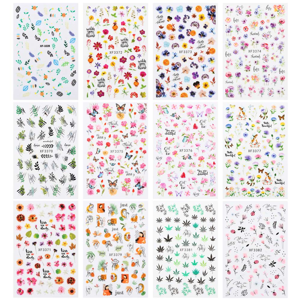 12 Sheets 3D Nail Stickers Colorful Floral Green Leaves Flower Design Spring Summer Decals Slider Colorful DIY Nail Art Decorate-Nail Inspo