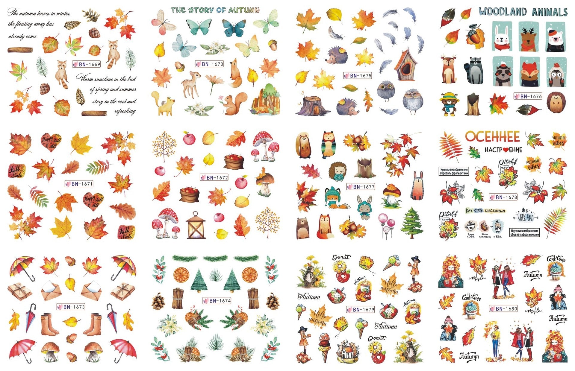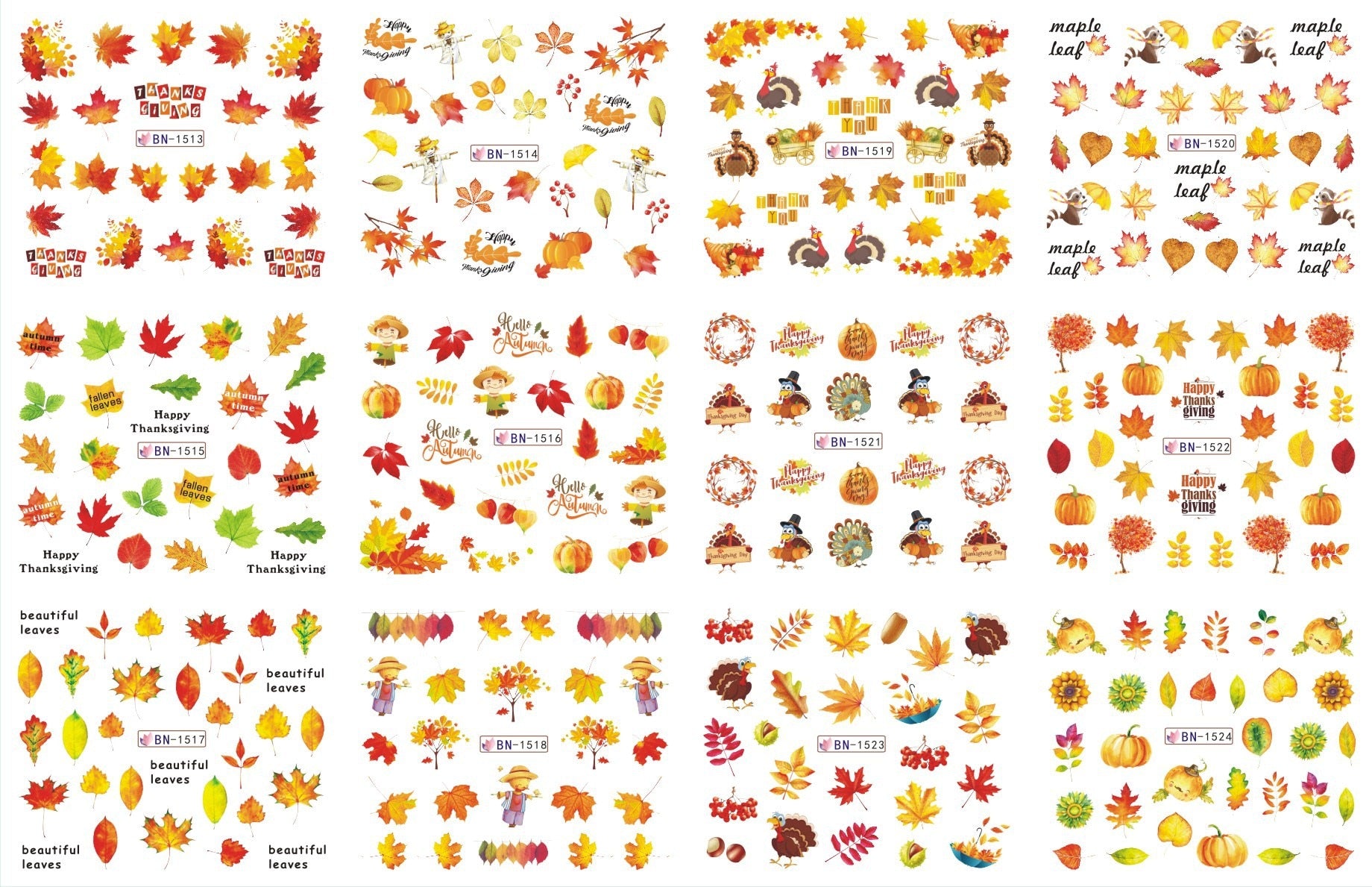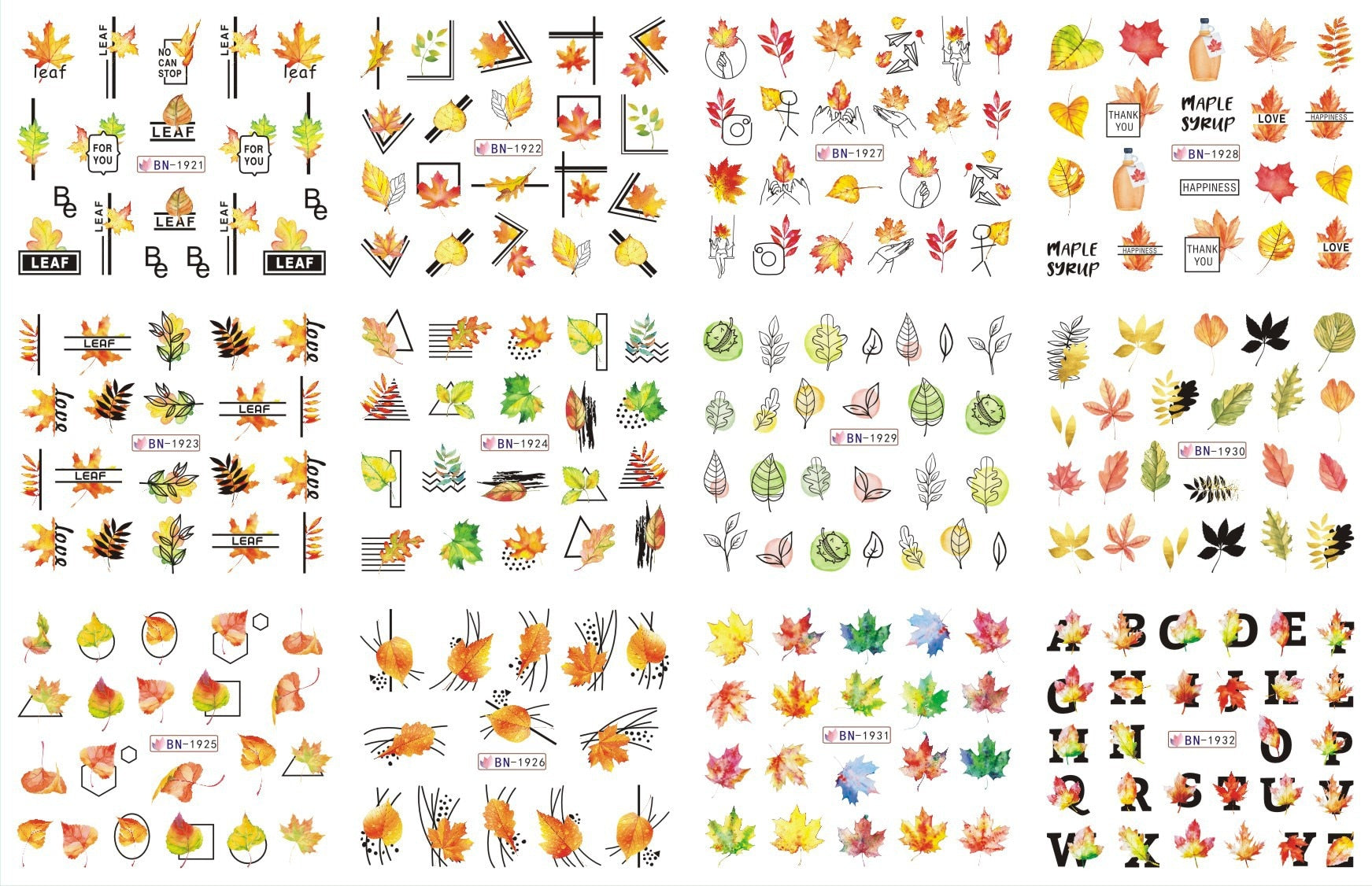 12pcs Fall Nail Stickers Set Maple Leaves Alphabet Flower Nail Water Stickers Transfer Decals Sliders DIY Manicures Decoration-Nail Inspo
