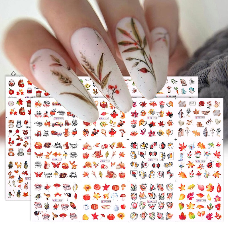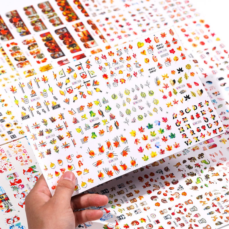 12pcs Sunflower Maple leaf Nail Stickers Sliders For Manicure Christmas Tree Nail Art Water Decals Transfer Foil Autumn Tips-Nail Inspo