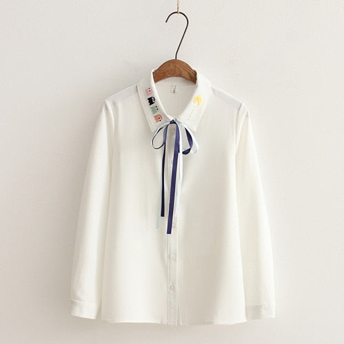 2017 Autumn White Embroidery Blouse with Lace Up Bow Turn-Down Collar Japanese Kawaii Female Shirts Tee Tops New Arrival T79615A