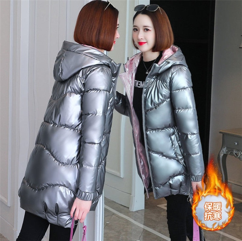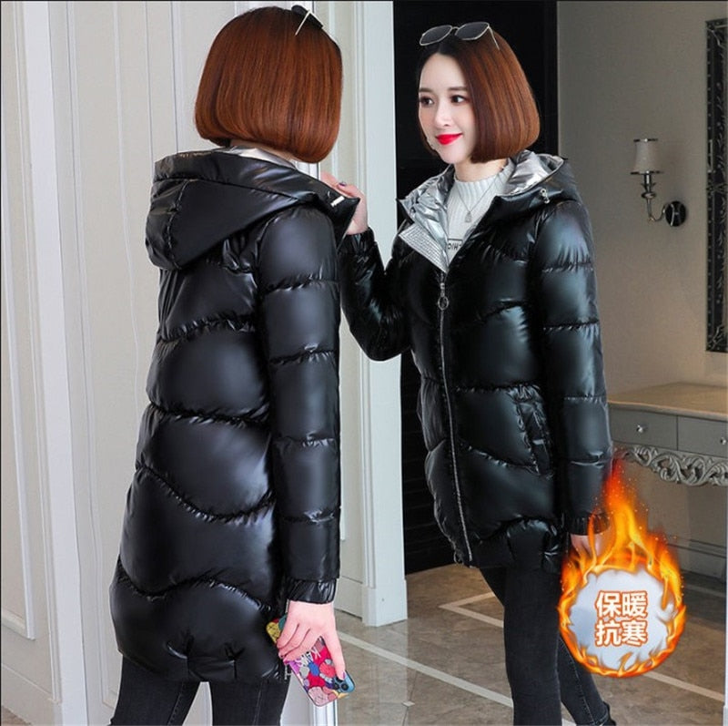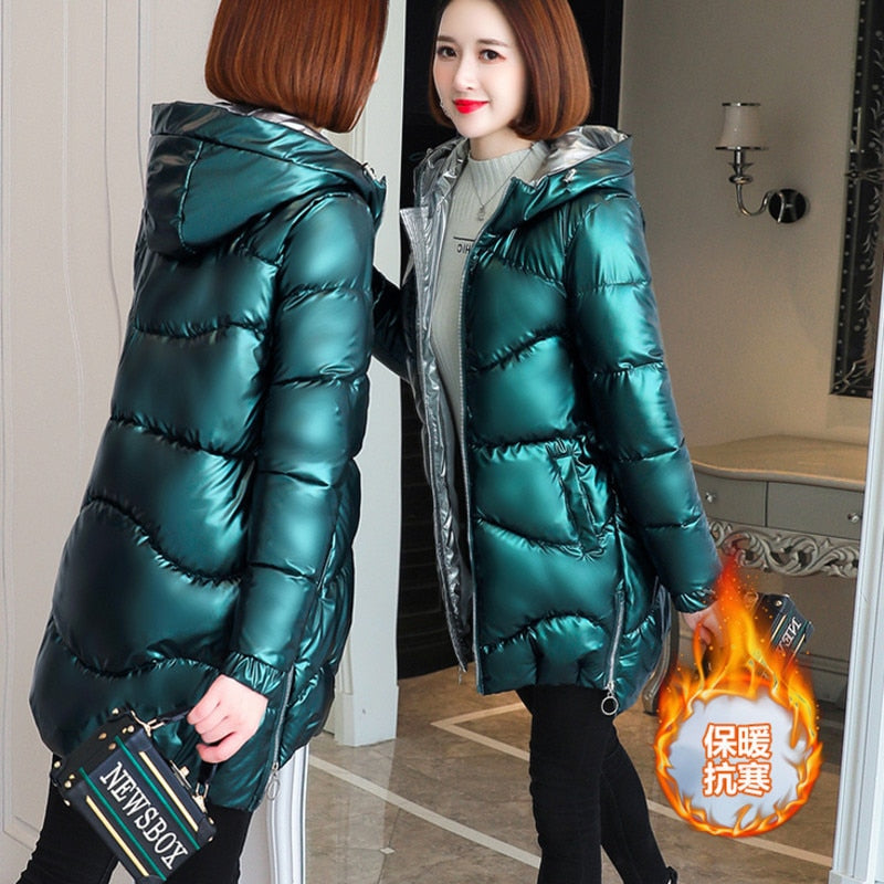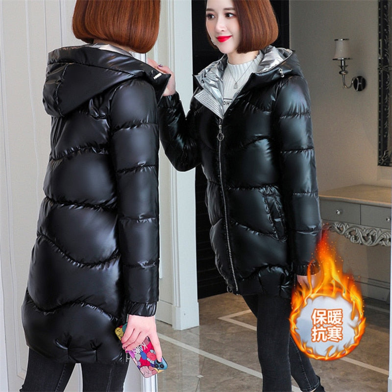 2021 Women Shiny Down Cotton Jacket Winter Jackets Warm Mid Long Cotton Padded Casual Hooded Parkas Overcoat Female Basic Coat