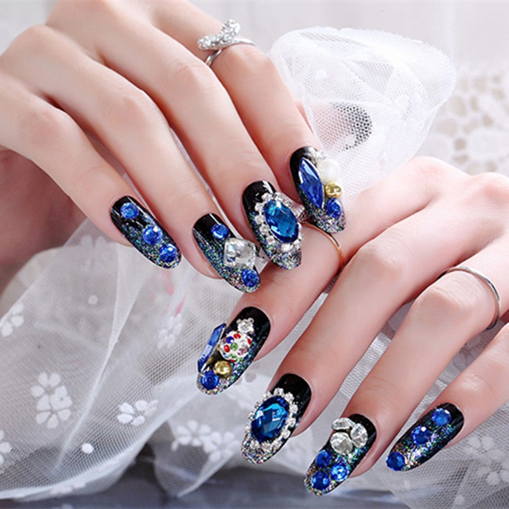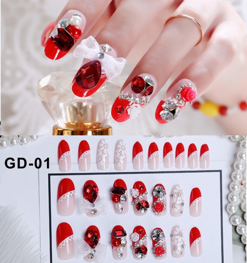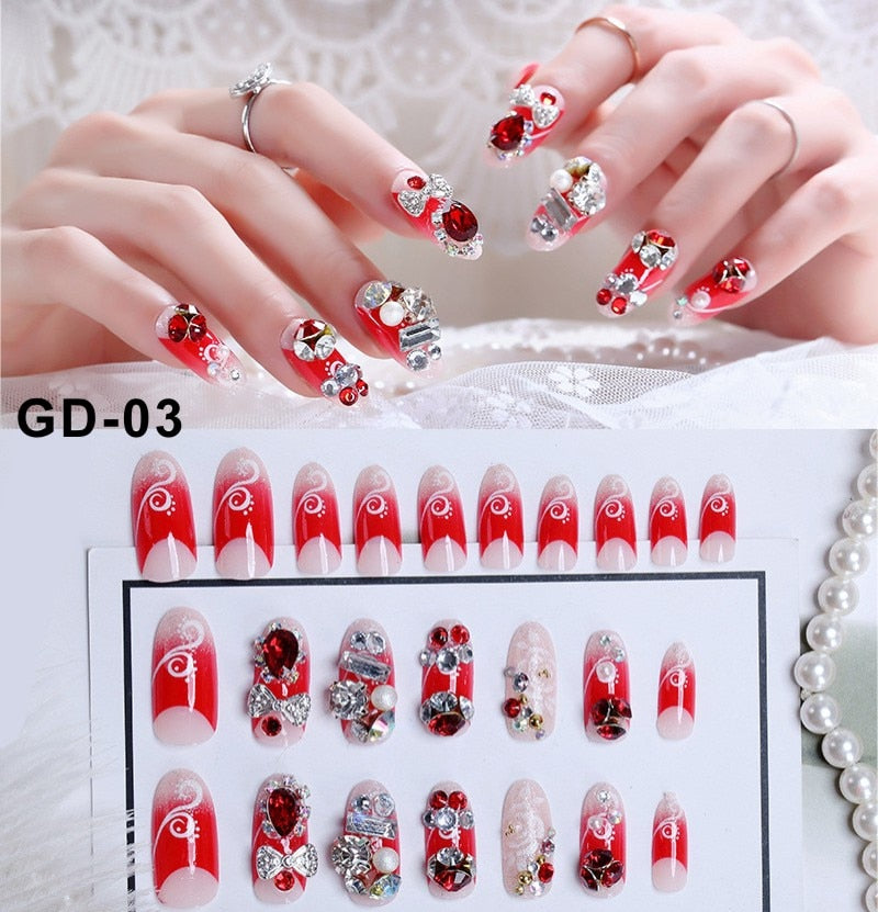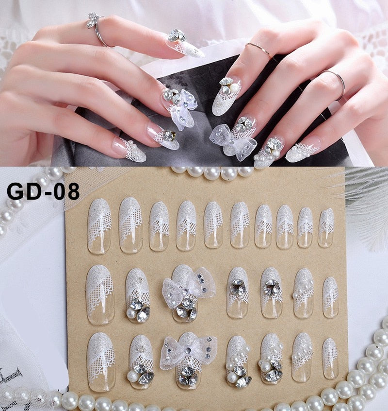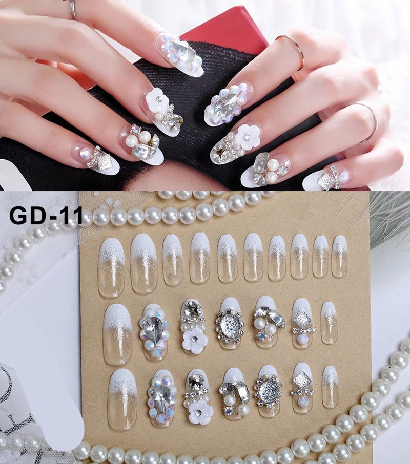 24Pc Rhinestone False Nails Bride Wedding Party Fake Nail Luxury Nail Art Faux Ongles Lady Full Nail Tip Patch with Glue Sticker-Nail Inspo
