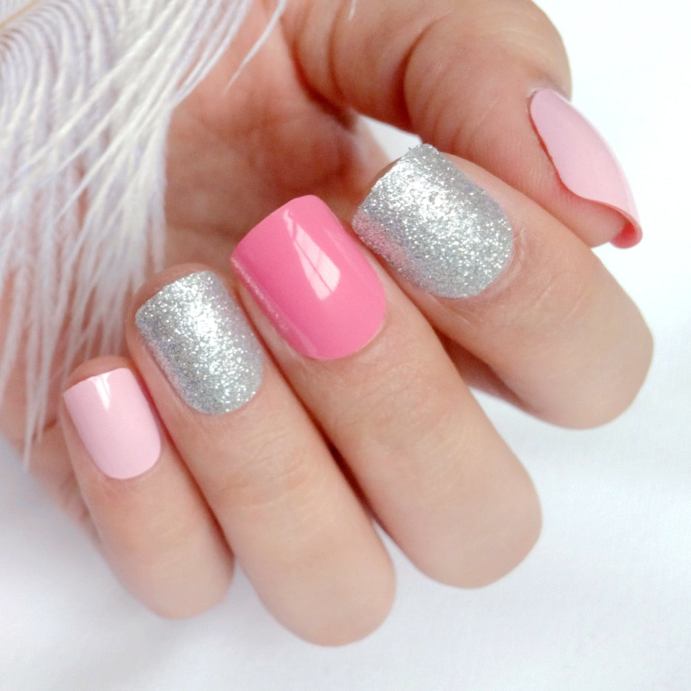 24Pcs Artificial Short Fake Nails 3D Holographic Sequins False Nails With Design DIY Full Cover Finger Tips Manicure Tools-Nail Inspo