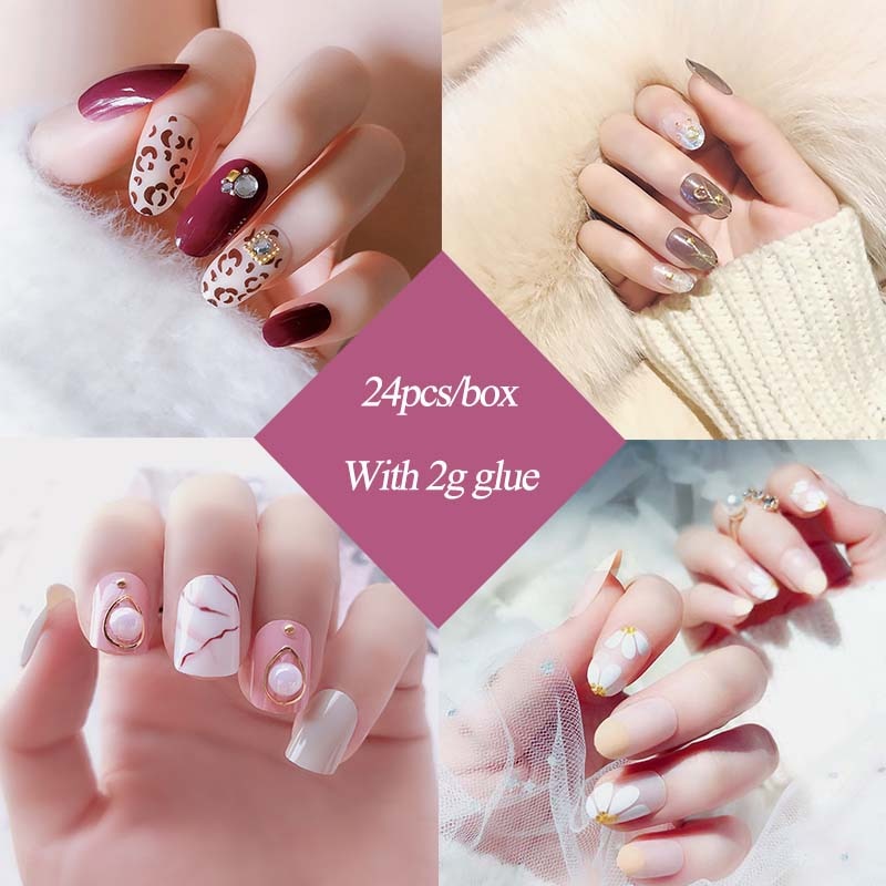 24pcs Bean Paste Color Decor Flower Full Cover Wedding Bride Full Nails Tips Artificial Nails Art Patches With Glue For Girls-Nail Inspo
