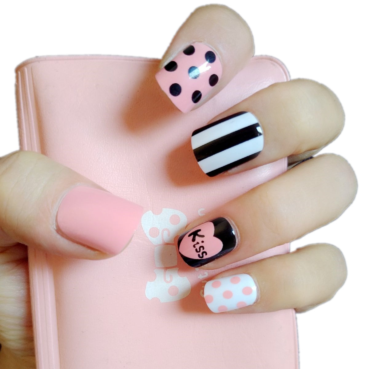 Looks cute on my nails. I had to adjust them according to my nail sizes. The glue fixed them tightly to the nail so far( the second day yet). I applied some top coat for extra shine.