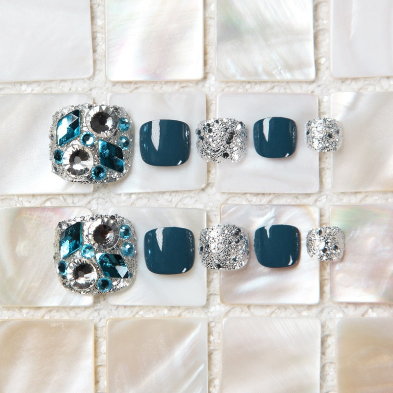 24pcs Blue Color Japanese Summer Wearable Foot Fake Nail Short Length Paillette Faux Rhinestone Decor Finished press on toenails-Nail Inspo
