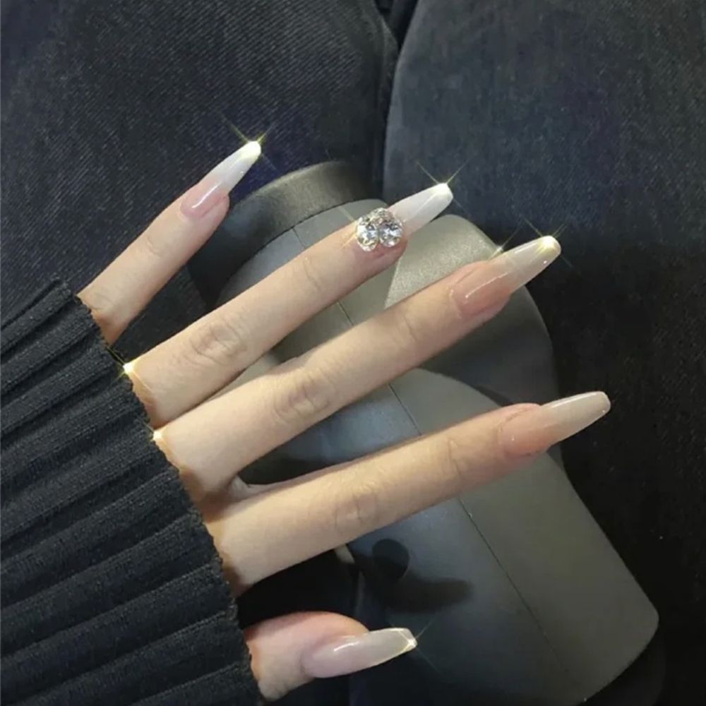 24PCS/Box Artificial Nails With Glue Milky White Pink Gradients Long Ballet Nail Stick Fake Nail Tips Full Cover Acrylic 2021-Nail Inspo