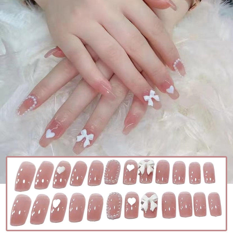 24Pcs/box Full Cover Short round press on nails Pink Dripping Shape Heart Bride nail tips Wearable Fake Nail with Glue for girls-Nail Inspo