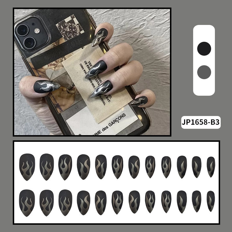 24PCS Dark Punk False Nails with Glue Gradient Long Detachable Fire Dragon on Nails Skull Flame Art DIY Fashion Manicure Tool-Nail Inspo