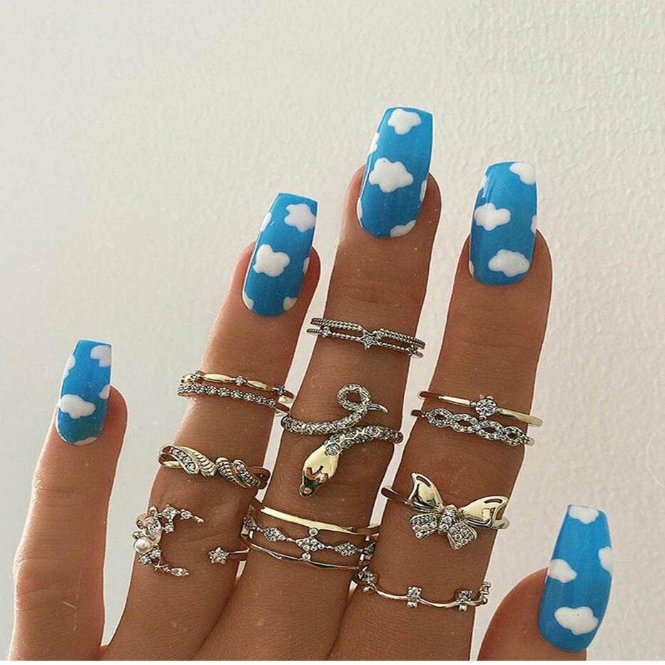 24Pcs Detachable Long Coffin False Nails Press on Nails Blue Sky Ballerina Wearable Fake Nail Full Cover Nail Tips Manicure Tool-Nail Inspo