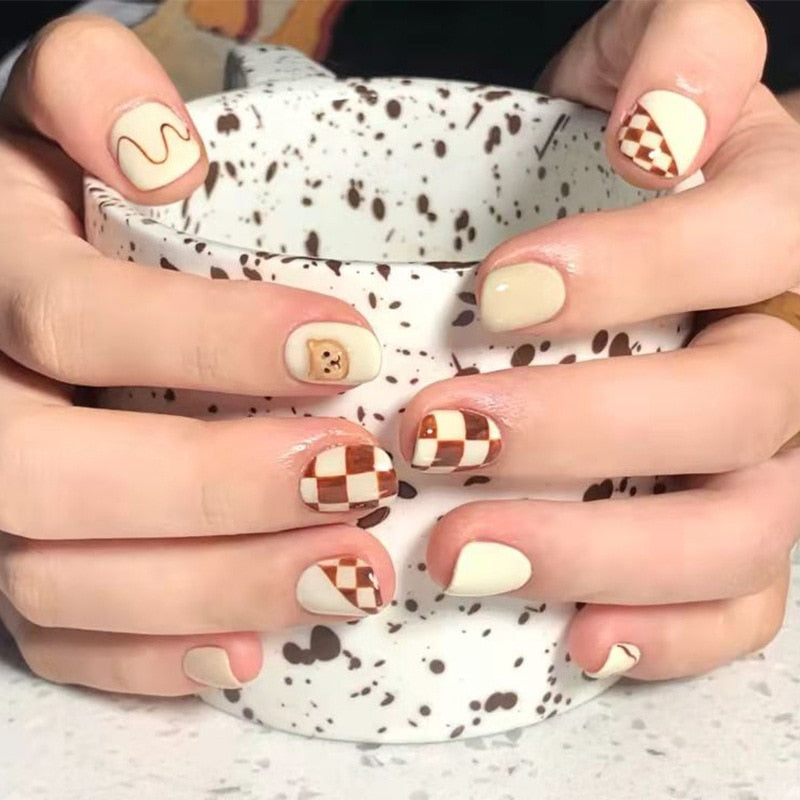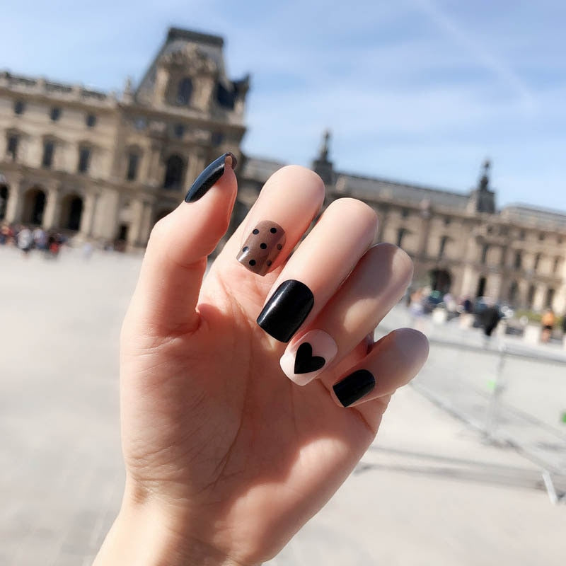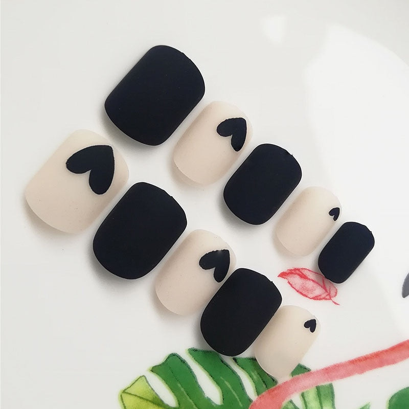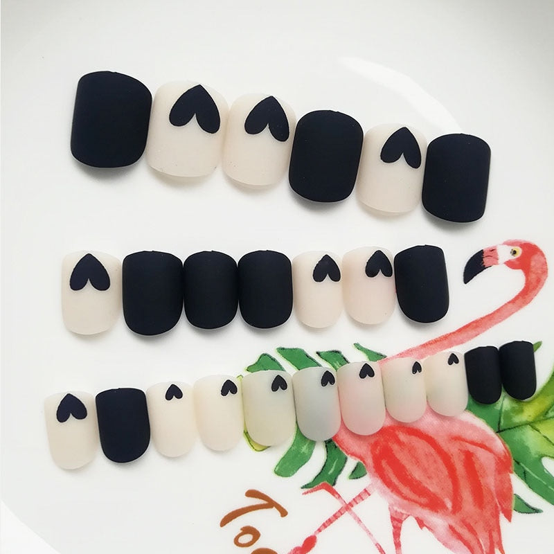 24Pcs Fake Nail Tips For Women Frosted Matte Nails with glue Nude with Black Love Heart Print designs Press On false fingernail-Nail Inspo