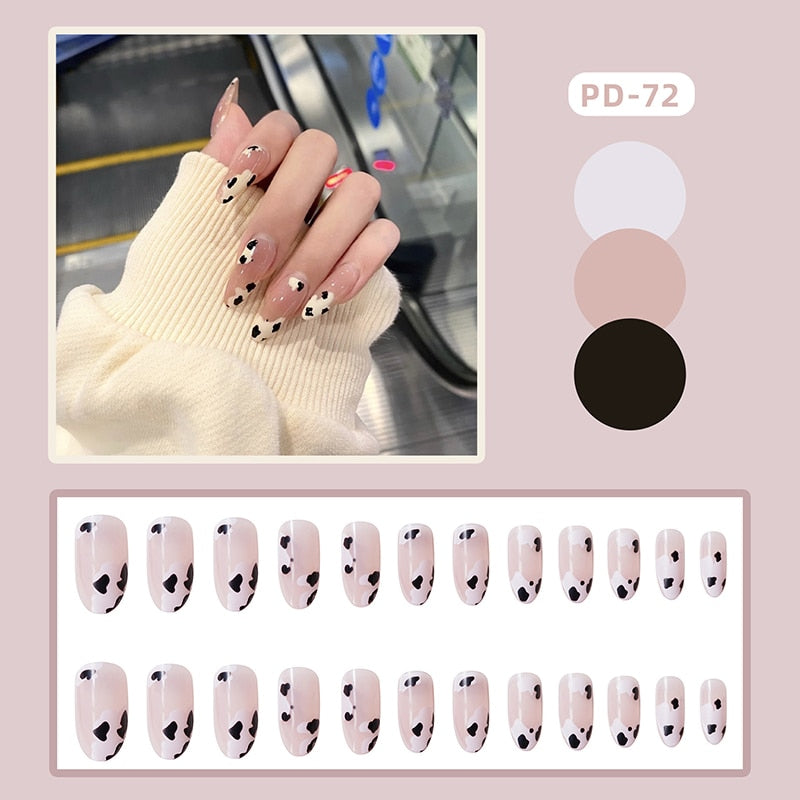 Looks cute on my nails. I had to adjust them according to my nail sizes. The glue fixed them tightly to the nail so far( the second day yet). I applied some top coat for extra shine.