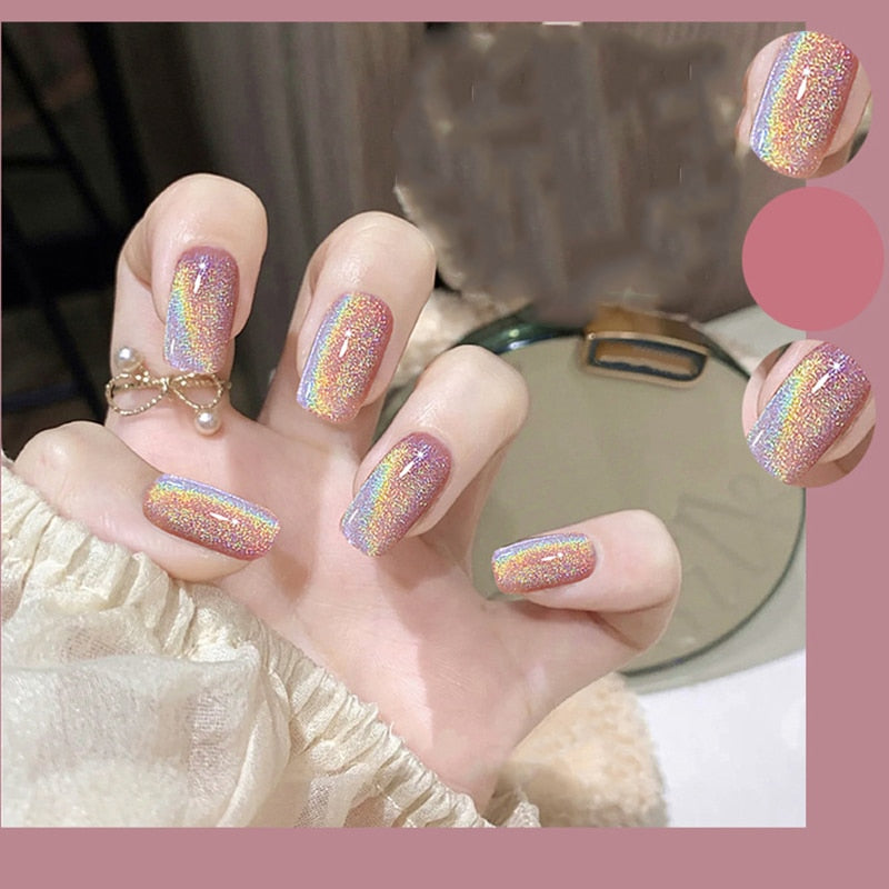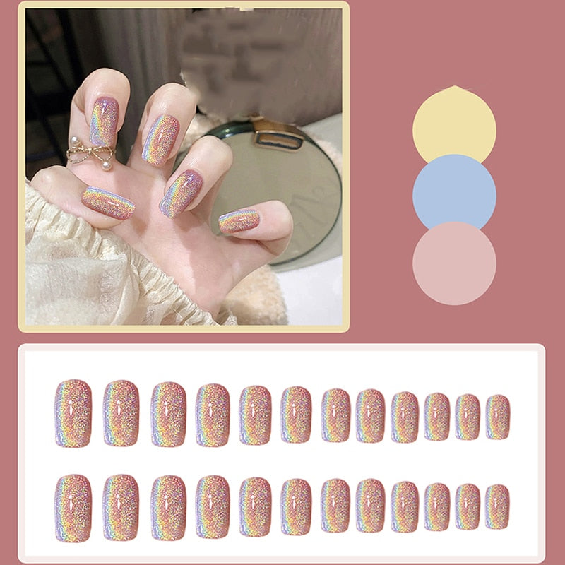 24PCS Fashionable Pink Metal Fake Nail press on Wearable Square Shape Glue model Decorated Finished Fake Nail with glue Product-Nail Inspo