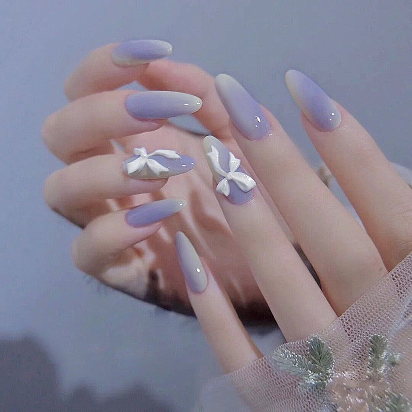 24pcs French Ribbon Decor White False Nails Pearl Crystal Design Press On Nail Mid Length Stiletto Manicure Patch False Nails-Nail Inspo