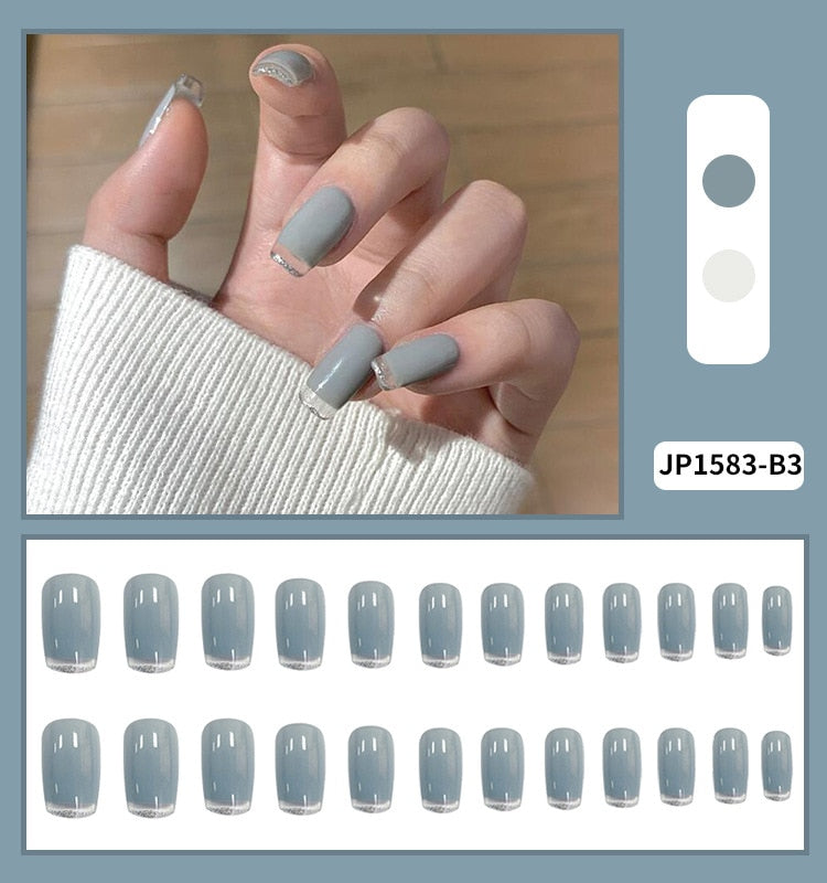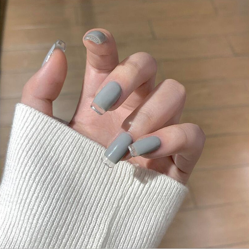 24pcs Grey Nail Patch Glue Type Removable Long Paragraph Fashion Manicure Save Time False Nail Patch SANA889-Nail Inspo