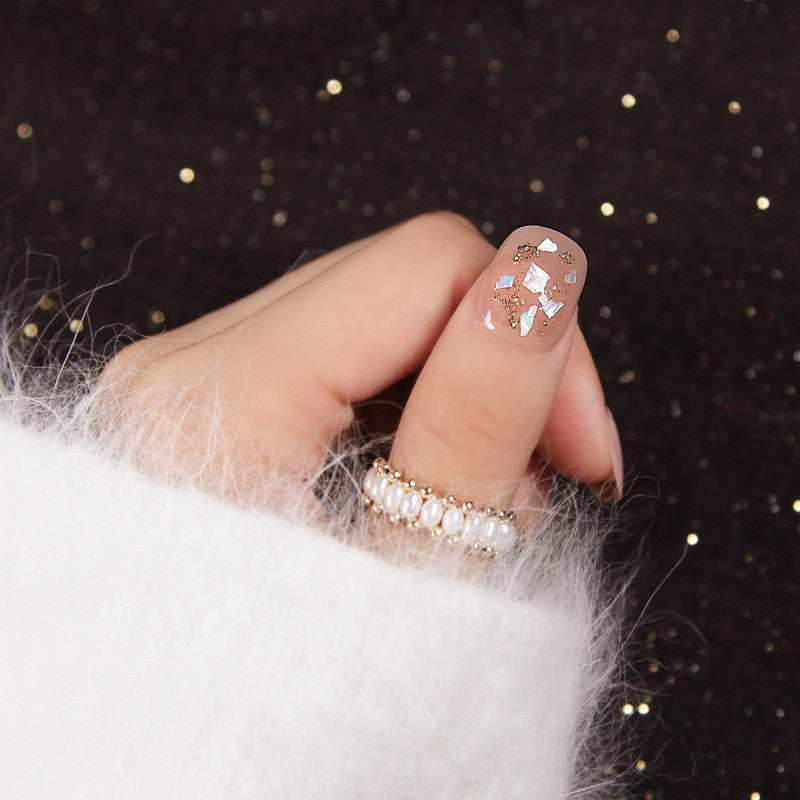 24pcs Nude Color press on nails short Paillette Gold Foil Woman Wearable Fake Nails with Glue Girls Daily Decoration Fingernail-Nail Inspo