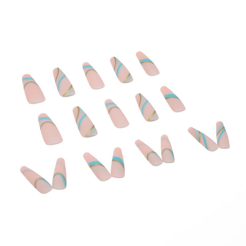 24pcs Nude Fake Nails Long Blue Gold Wave Pattern Coffin False Nails Acrylic Detachable Matte Full Nail Decoration Art Tips-Nail Inspo