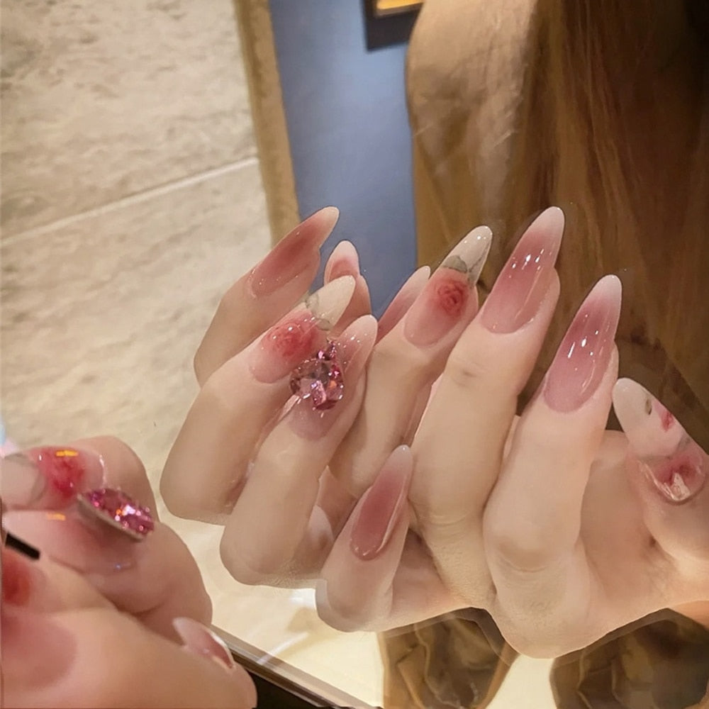 24pcs Pink Rose Design False Nail Patch Coffin Fake Nails Removable Long Paragraph Fashion Manicure Nail Art Press On Nail Tips-Nail Inspo
