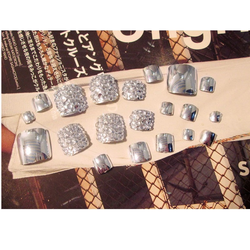 24Pcs/Set Beauty Chic Toe Nails Silver Metallic Finished Full Cover for Foot with Rhinestone Feet Artificial False Nail-Nail Inspo