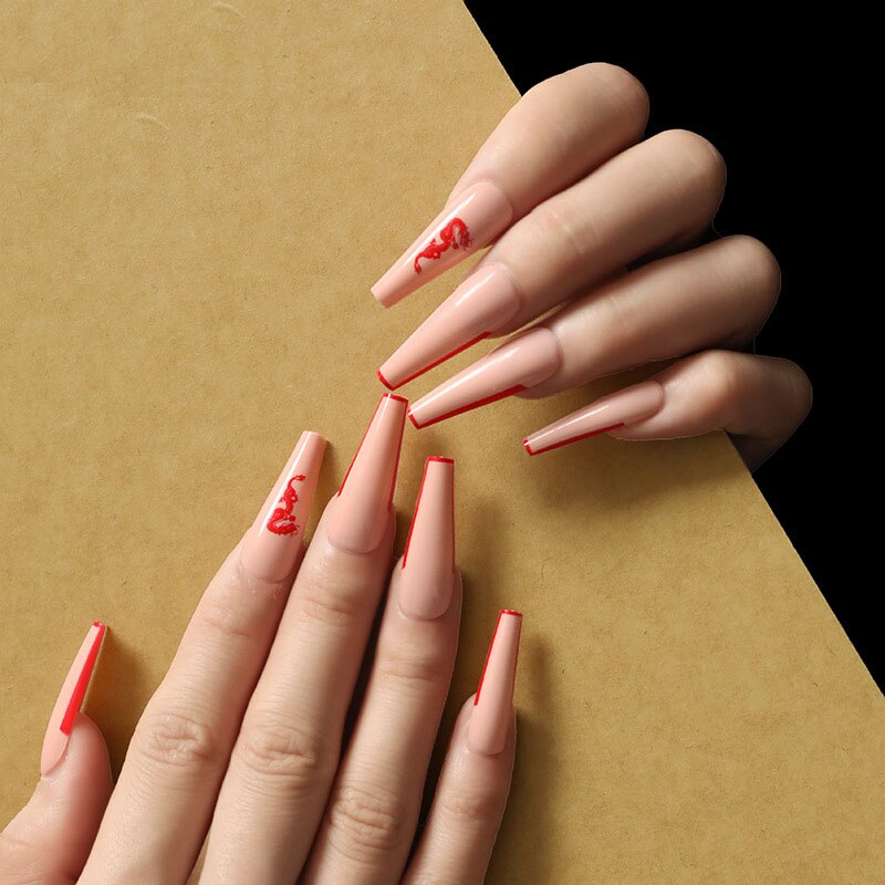 24pcs/Set False Nails Long Red Dragon Pattern Coffin Shaped Press On Nails Acrylic Ballerina Nail Decoration Art Tips-Nail Inspo