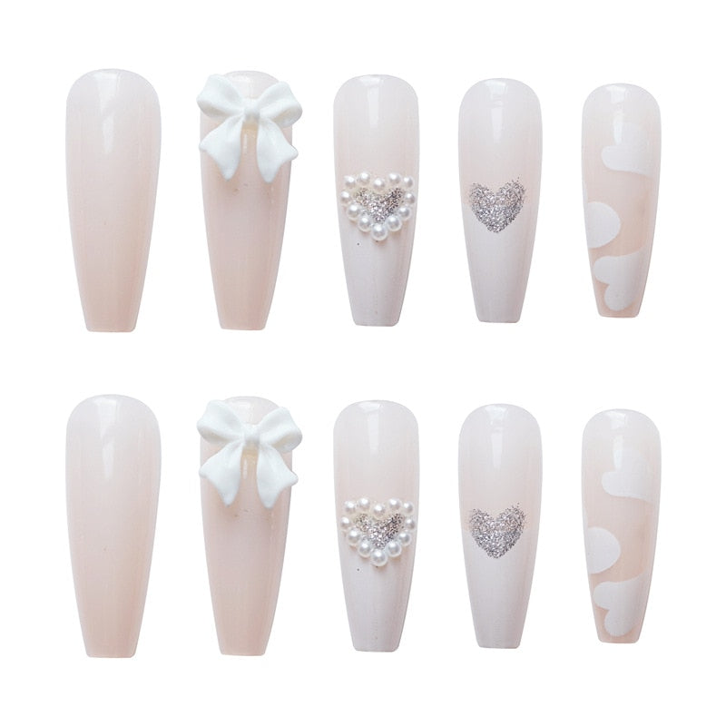 24pcs/Set Long Coffin Fake Nails Pearl Heart Pattern White French False Nails Acrylic Bride Ballerina Nail Decoration Art Tips-Nail Inspo