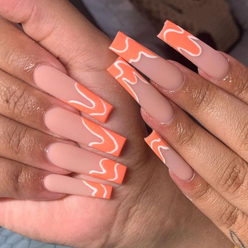 24pcs/set Long Coffin Fake Nails Pre-design Foils Decal Pink Orange Full Cover Nail Art Tips Ballerina Acrylic False Nails 515-Nail Inspo