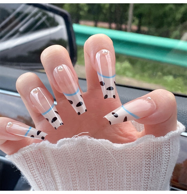 Looks cute on my nails. I had to adjust them according to my nail sizes. The glue fixed them tightly to the nail so far( the second day yet). I applied some top coat for extra shine.