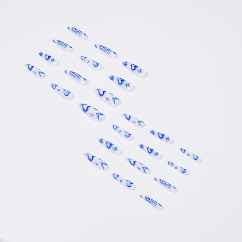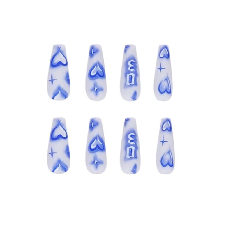 24pcs/Set Press On Nails Extra Long Blue Ink Heart Pattern Coffin Fake Nails Removable Ballerina Nail Accessory Art Full Tips-Nail Inspo