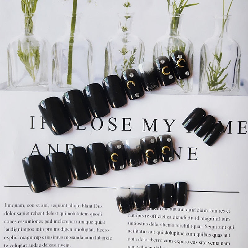 24pcs/set Punk Black Fake Nails Gold Moon Decal Middle Long Square Full Cover False Nails Women Nail Salon Nail Tips-Nail Inspo