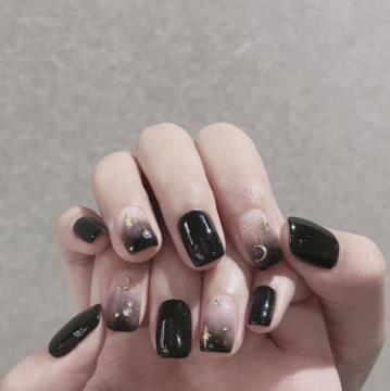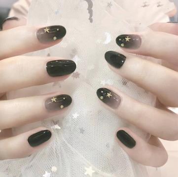 24pcs/set Punk Black Gradient Fake Nails Round Full Cover Gold Moon Star Decal Nail Art Tips Artificial Press on Nails-Nail Inspo