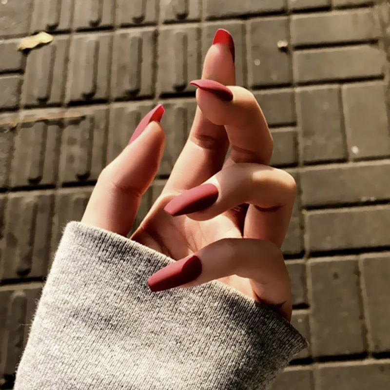 24pcs/set Red Frosted Ballet Medium Length Fake Nails with Glue Fashion Pure Color Nail Patches Women press on nails coffin-Nail Inspo