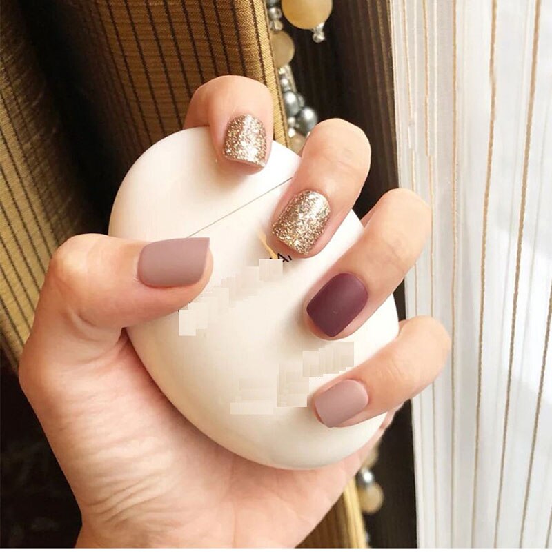 24pcs/Set Short Gold Glitter Fake Nails Mixed Grey Purple Acrylic Nail Accessories with Glue Sticker Matte Full Press on Tips-Nail Inspo