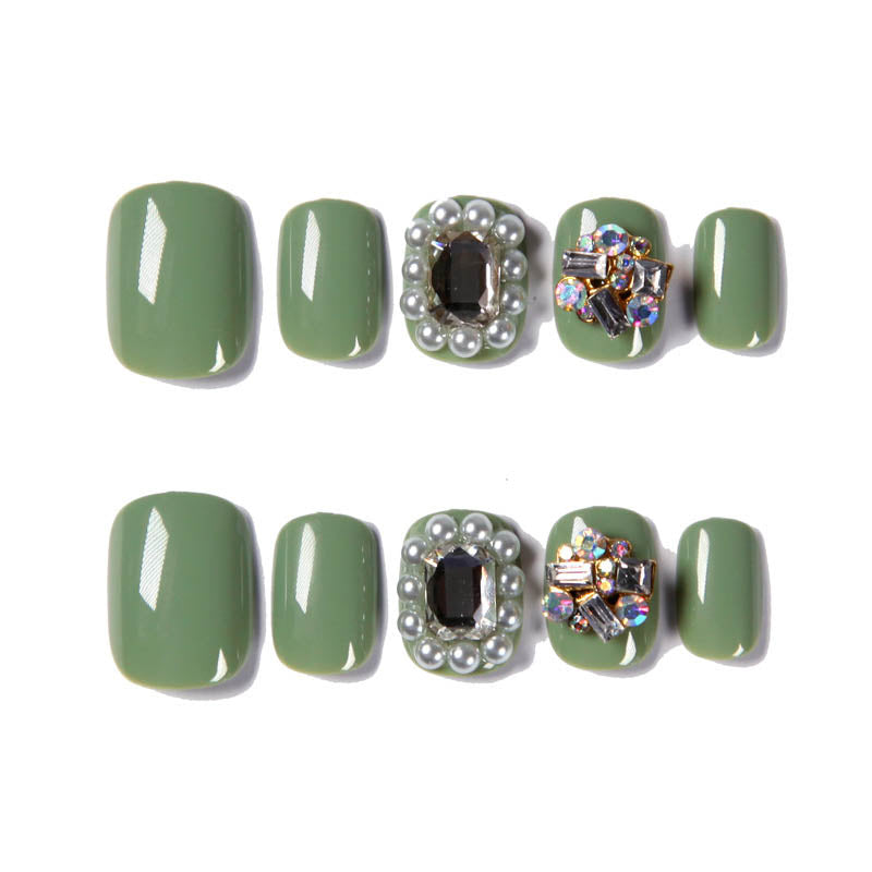 24pcs Women Wearable Full Cover Fake press on Nails Fresh Japanese Style Matcha Green with Shiny Rhinestone fake nails with gule-Nail Inspo