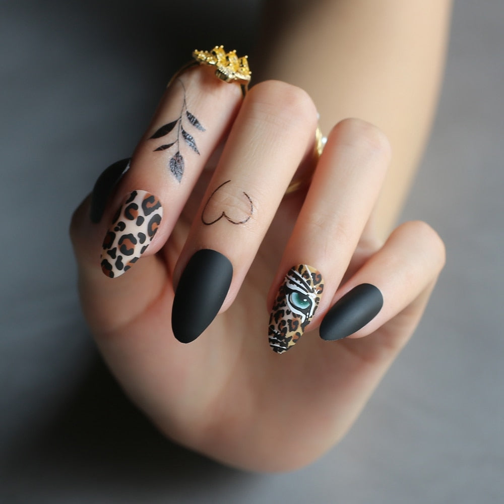 28pcs /bag Short Fake nails for Almond Leopard print acrylic nails with black matte Tiger nails False stilettonails-Nail Inspo