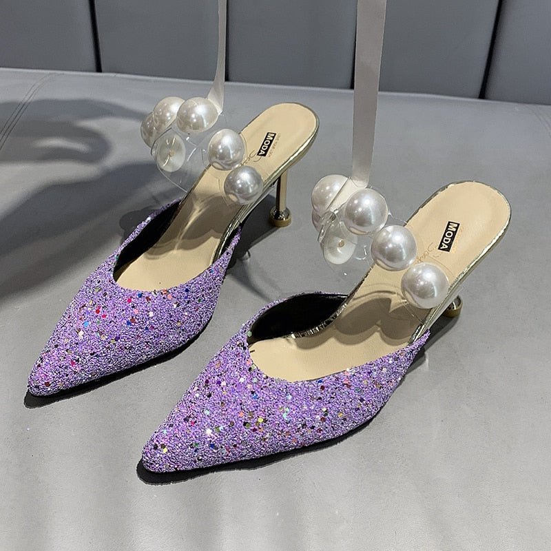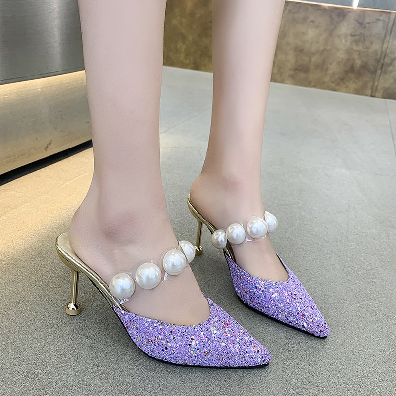 34-40 Pearl Black Sandals Women Summer Autumn Shoes Woman Thin Heels 2022 Womens Outdoor High Heels Woman Mules