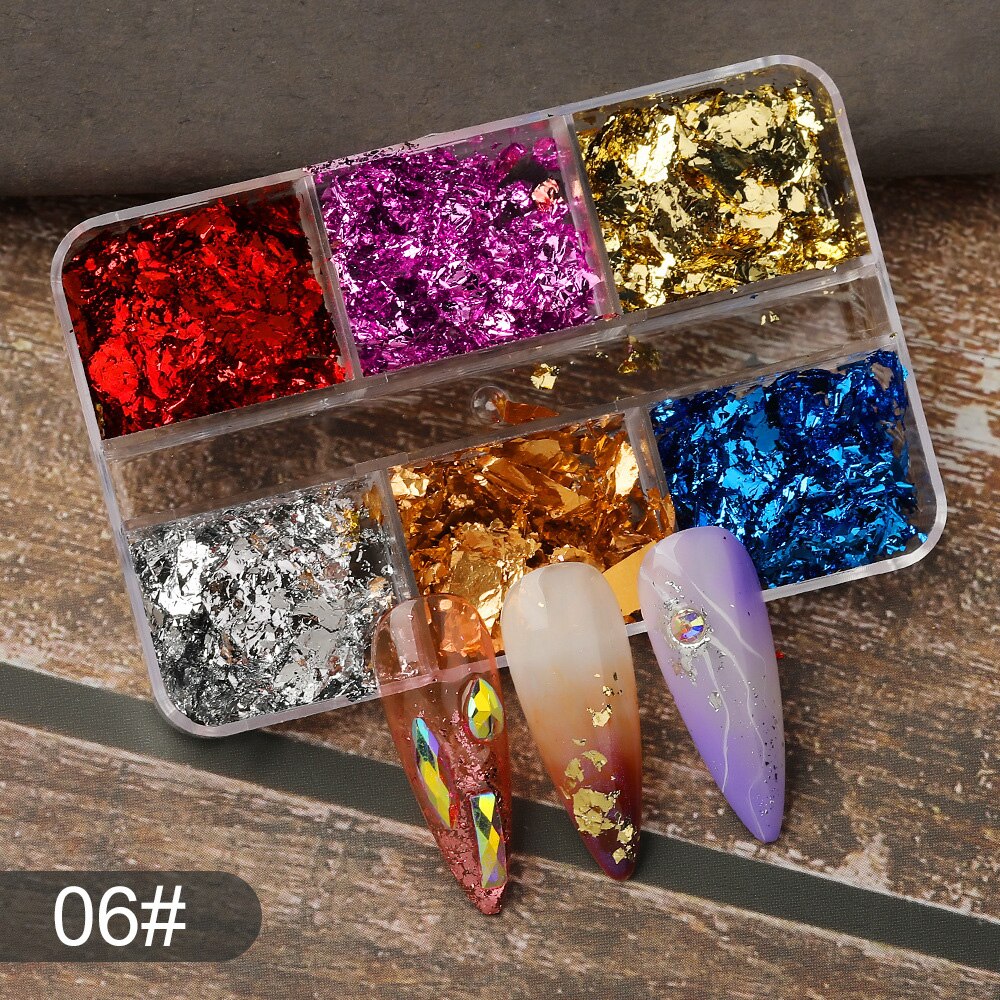 6 Grids Sparkly Foil Nails Sequins Irregular Aluminum Gold Red Summer Design Set Mirror Chrome Glitter Flakes Gel DIY Manicure-Nail Inspo