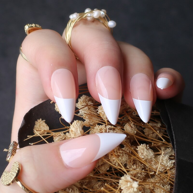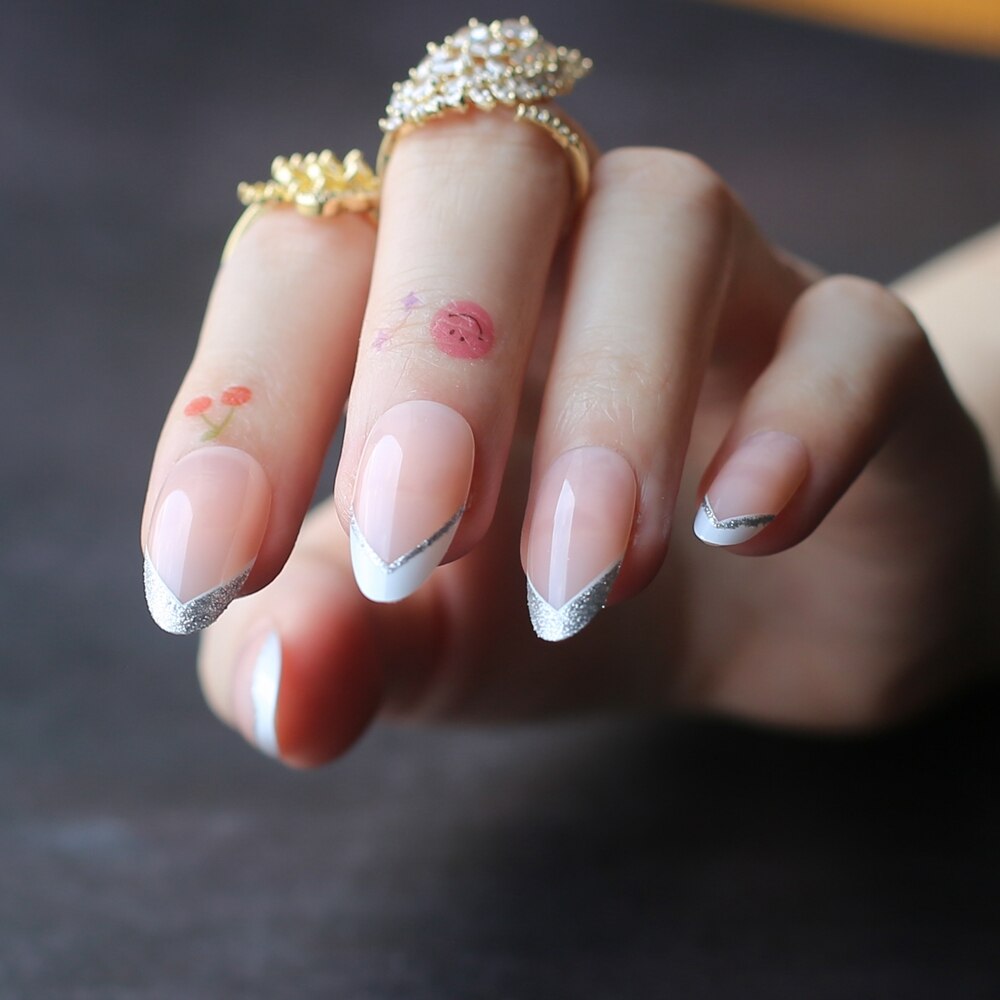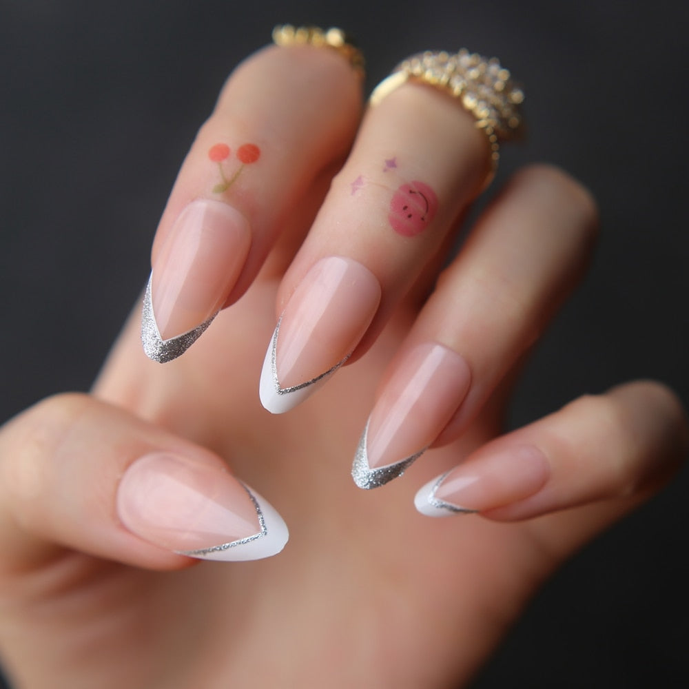 Almond Fake nails nude Glitter V french New design Medium length Natural False nails Classic-Nail Inspo