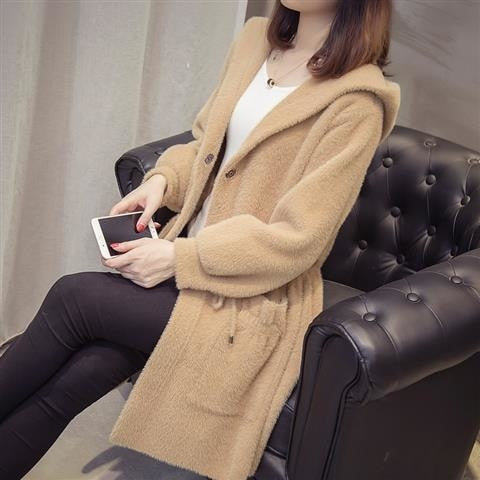 Autumn And Winter New Mink Like Cashmere Coat Women's Cardigan Korean Hooded Loose Medium Length Mink Sweater Coat Thickened