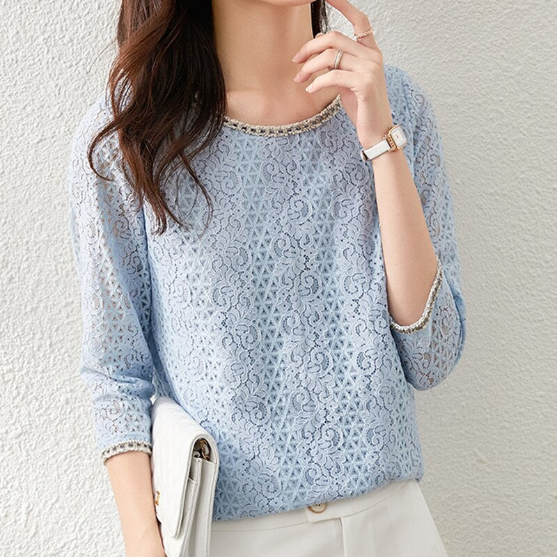 Autumn New High-end Crocheted Hollow Blouse Blue O-neck Three-quarter Sleeve Fairy Lace Blouse Elegant Apricot Print Shirt 16704