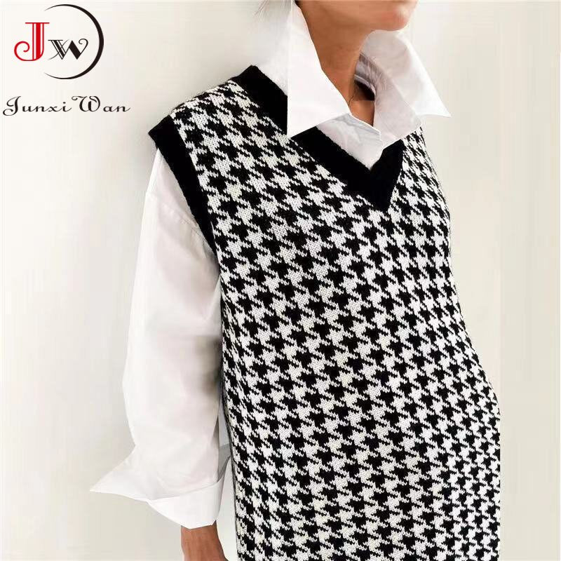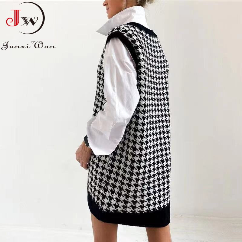 Autumn Winter Loose Houndstooth Women Knitted Vest Sweater Vintage Elegant Mid-Length Autumn Winter Loose Tops Pullover Jersey