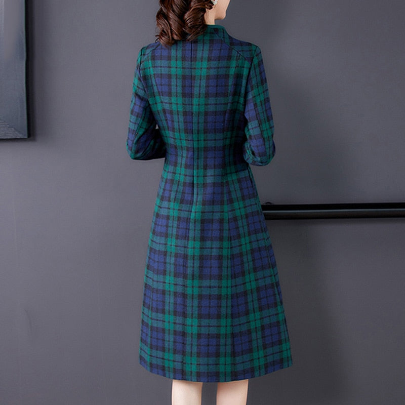 Autumn winter Women Vintage Plaid dress New Long Sleeve Green Plaid Fashion Dress Mid-Long Ladies Thickening Woolen Dress Female