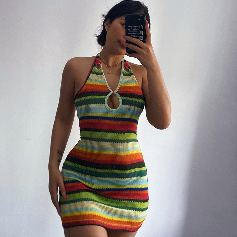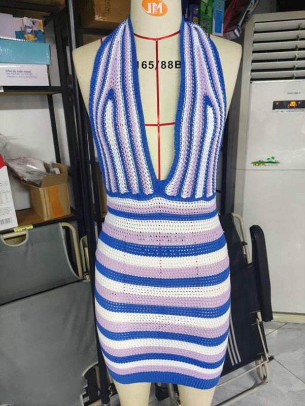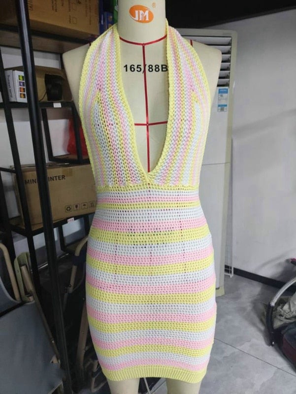 Beach Style Knitted Dress Chic Women Summer Sexy Backless Deep V-neck Halter Dress Y2K Streetwear Vacation Casual Vestido 1226