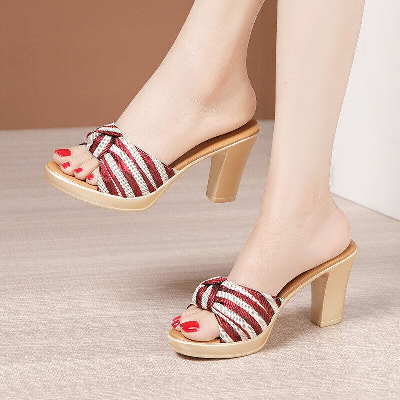 Big Size 32-43 Open Head Bow Stripe Slides Women Shoes Sumer 2022 High Heels Slippers Ladies Office Beach Slippers