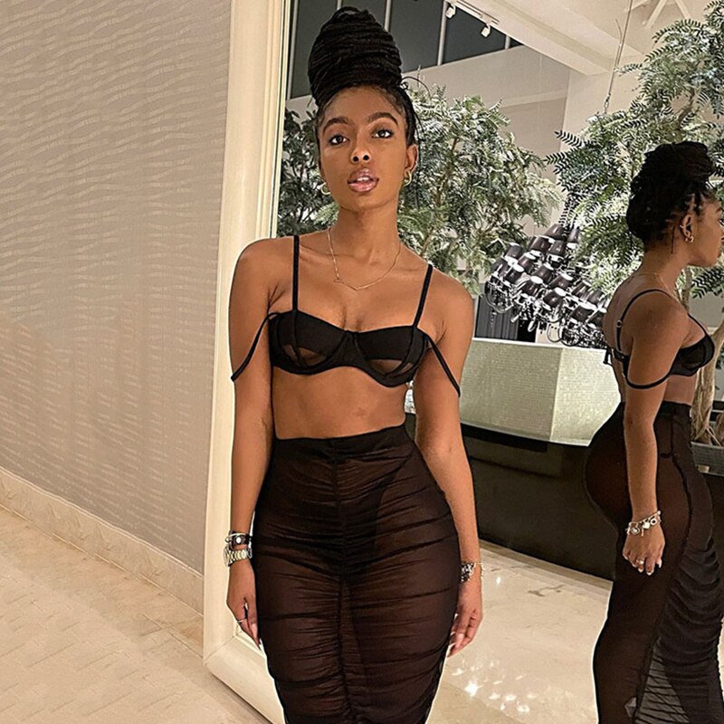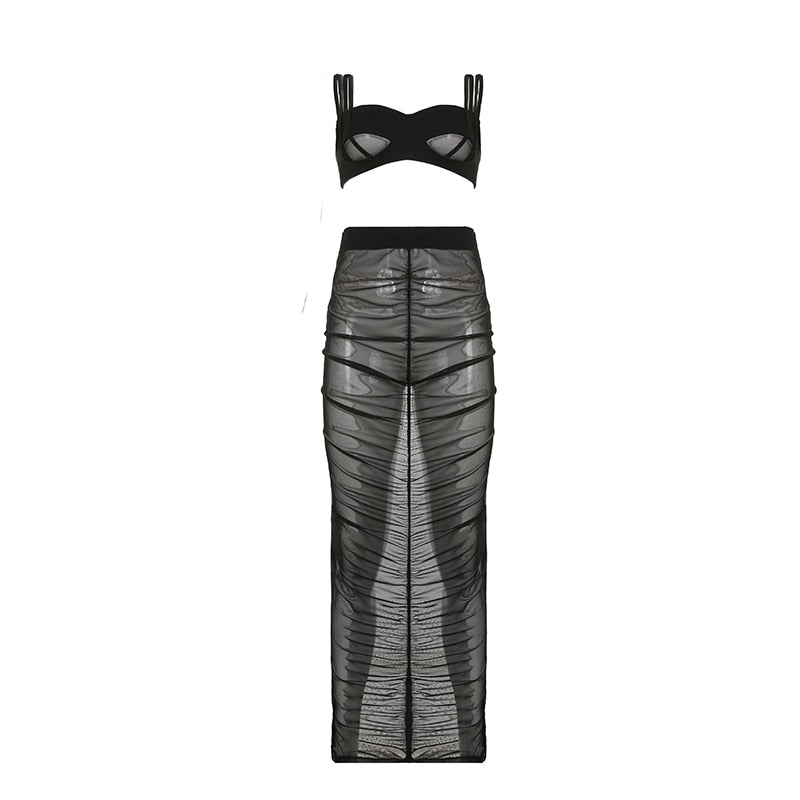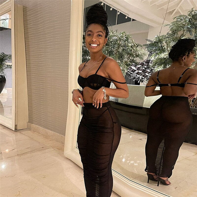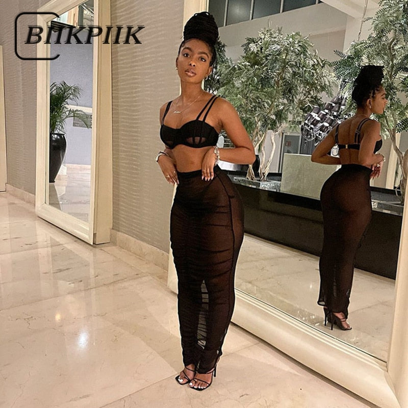 BIIKPIIK 2 Piece Matching Sets Women Casual Sexy Crop Tops + Maxi Skirts See-through Mesh Fashion Streetwear Clothing Skirt Suit