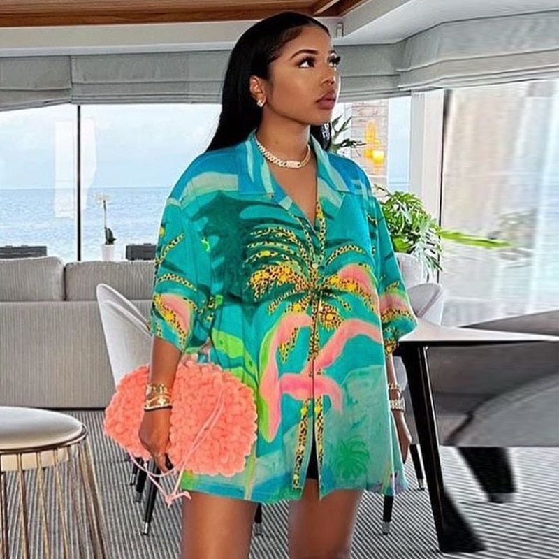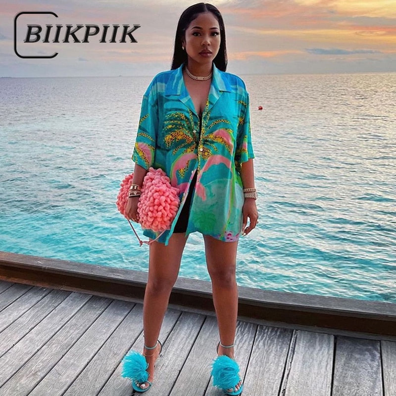 BIIKPIIK 2022 Summer Beach Style Oversized T-shirt Women Buttons Turn-down Collar Short Sleeve Tops Loose Casual Vacation Blouse