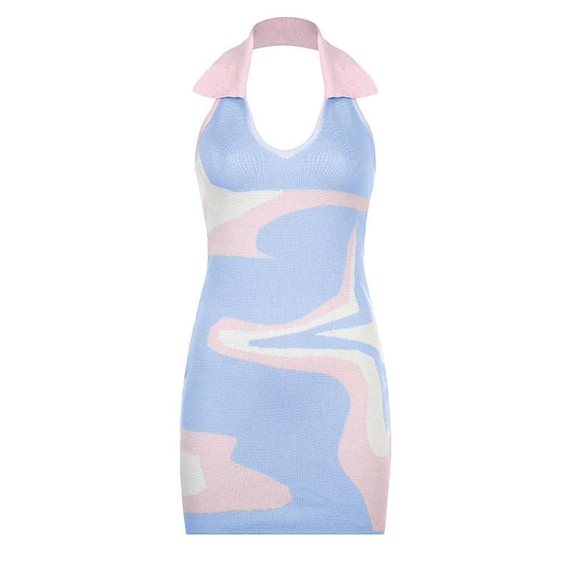 BIIKPIIK Casual Style Dress Women Summer Printing Knitted Dress Sexy Low Cut Neck-mounted Sleeveless Party Vintage Mini Dresses