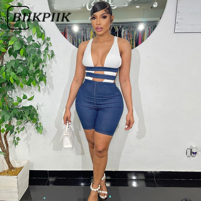 BIIKPIIK Contrast Women Elegant Playsuits Sleeveless Low Neck Cleavage Sexy One Piece Streetwear Skinny Rompers Casual Overalls