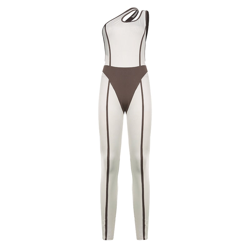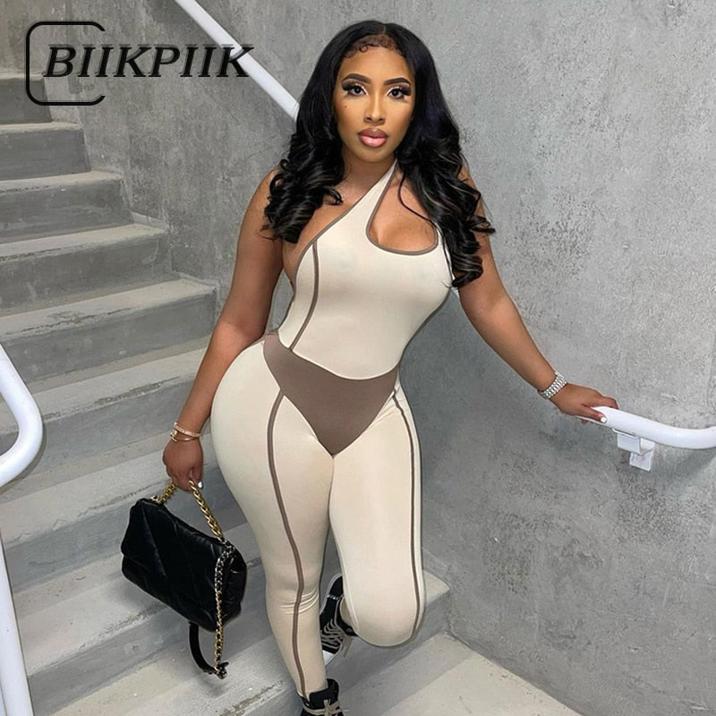 BIIKPIIK Cycling Fitness Jumpsuits Women Yoga Tracksuit One Shoulder Sleeveless Patchwork Sporty Stretch Overall Bodycon Rompers