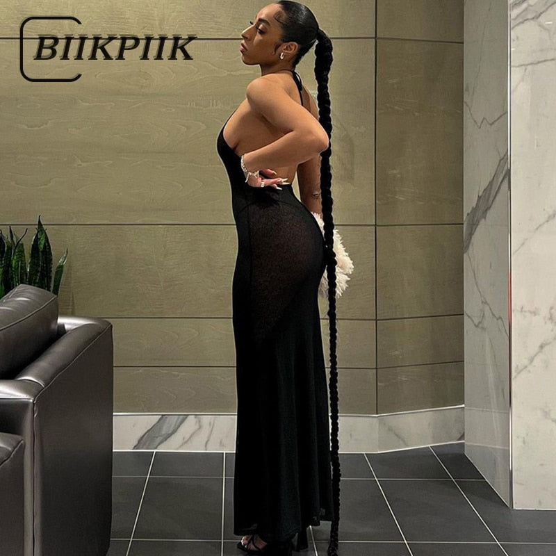 BIIKPIIK Elegant Maxi Dresses For Women Partywear Backless Sleeveless Neck-mounted Lace-up Sexy Dress Slim Spring Casual Clothes